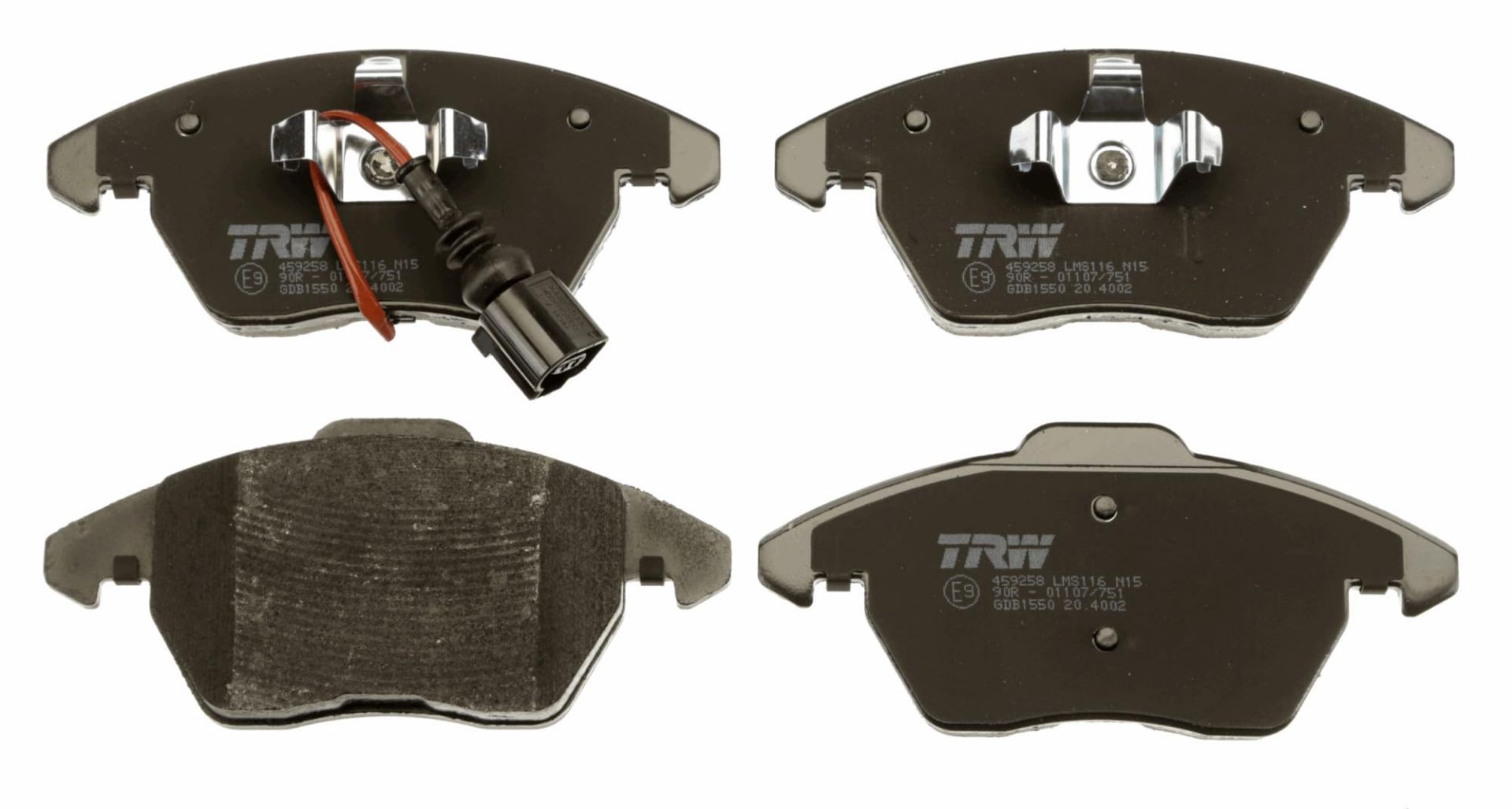 Juego de pastillas de freno delanteras TRW GDB1330, con sensor de desgaste incorporado. Rendimiento equivalente al original, bajo nivel de ruido y excelente resistencia a altas temperaturas. Apta para VW Golf, Audi A3, Seat León, Skoda Octavia y otros del grupo VAG.